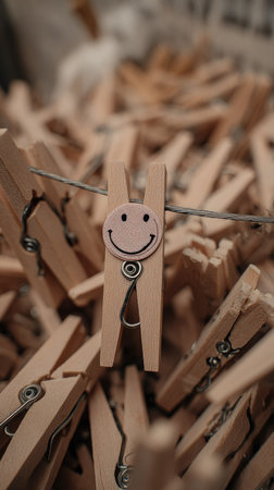 A close-up captures a single wooden clothes pin adorned with a smiling face. The pin is positioned against a background of numerous similar wooden pins. Warm tones and natural textures dominate, with soft lighting enhancing the composition. This image could be suitable for various design, advertising, or conceptual applications.