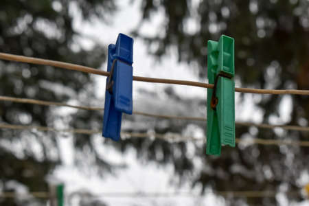Colorful clothespins on a clothesline in the garden. Selective focus.