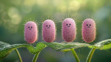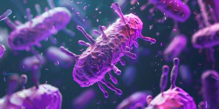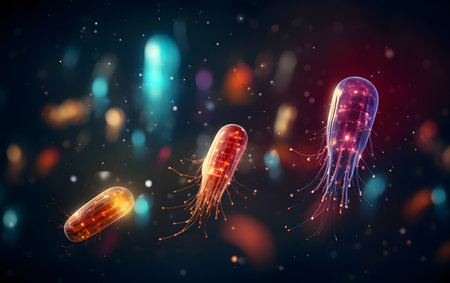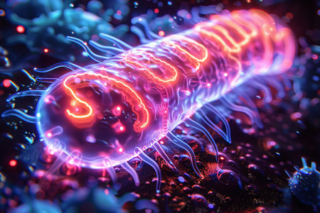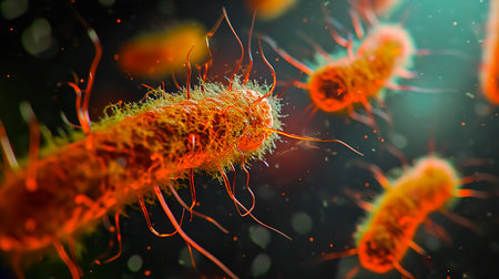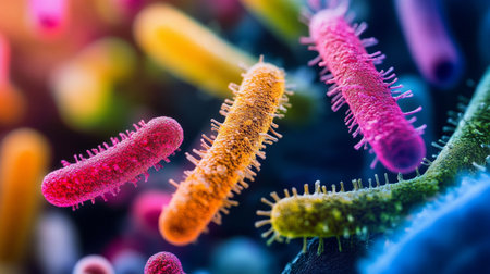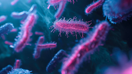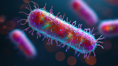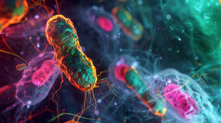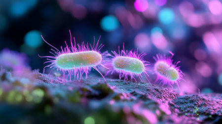 Microscopic close-up of colorful, vibrant bacteria highlighting their intricate structures, including flagella and pili, essential for motility and attachment. Ai generated