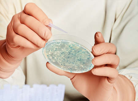Hands in gloves picking up bacterial colonies from bacterial plate for molecular cloning