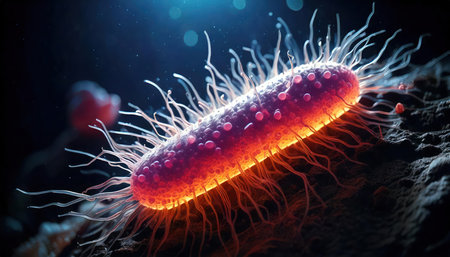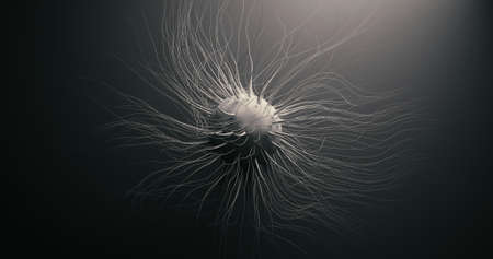 This detailed close-up image showcases a single bacteria cell with hairlike structures, set against a dark background. Ideal for scientific and educational purposes.
