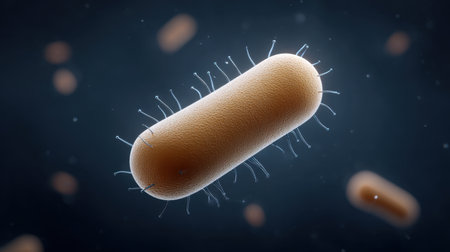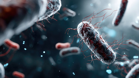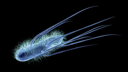 Escherichia coli bacteria, 3D illustration. E. coli is a Gram-negative rod-shaped motile bacterium covered with flagella