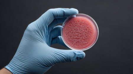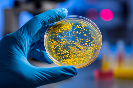 A detailed image showcasing microbial growth in a petri dish held by a gloved hand, emphasizing a sterile environment ideal for scientific research and education.