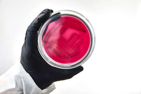 Scientist's hand in latex glove holding the bacteria growing petri dish (Salmonella species on SS agar, selective medium) , medical background