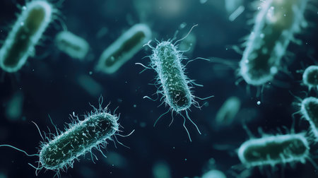 This detailed image features vibrant bacteria with hair-like structures, showcasing their dynamic motion in a microbial environment, highlighting scientific exploration.