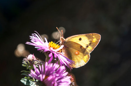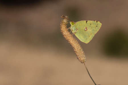 Golden Butterfly. Colias Hyale. Pale Clouded Yellow Butterfly with golden eight. Macro with very shallow depth of field on a warm summer evening