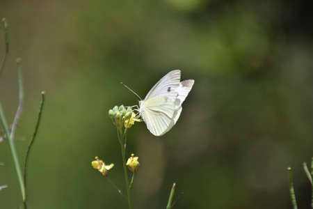 yellow butterfly on a flower, a blurred green garden background, closeup