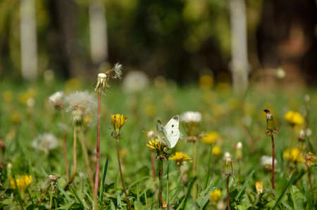 White butterfly and garden lawn with dandelions