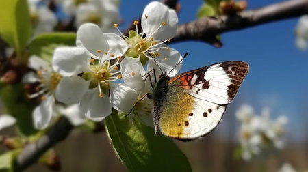 Butterfly on a branch of a blossoming pear tree.