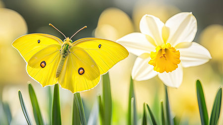 A vibrant yellow butterfly gracefully rests next to a stunning yellow daffodil, surrounded by lush greenery in a tranquil garden setting. Perfect for nature lovers.