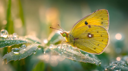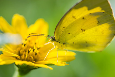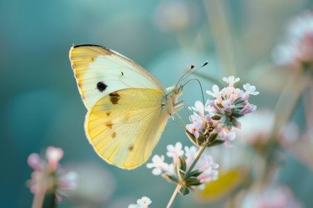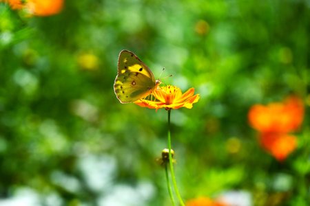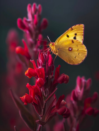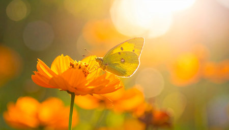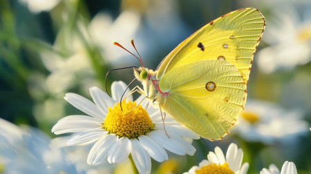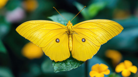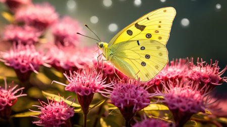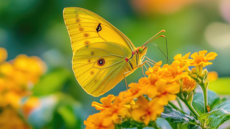 Close-up of a beautiful yellow butterfly with delicate wings resting on vibrant blossoms in a sunny garden. Showcasing the serene beauty of nature. Pollination