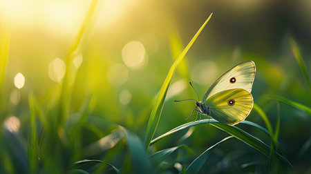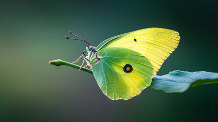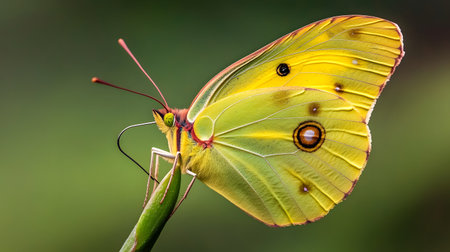 Detailed view of a butterfly with striking yellow wings, perched gently on a small grass, set against a soft, blurred green background, illustrating natural beauty and wildlife.