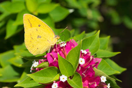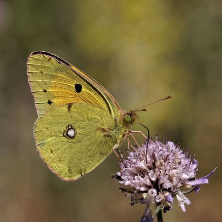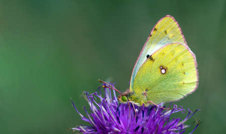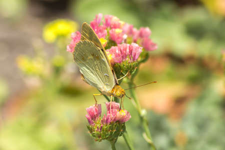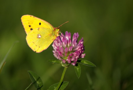 A clouded yellow butterfly colias croceus sucking nectar from a pink flower