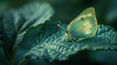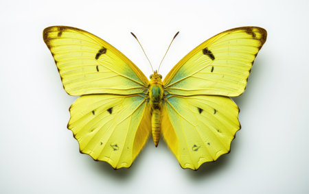 paphachia brevipes, a yellow butterfly, is captured in macro detail against a white background. this photograph, reminiscent of zhang kechun's style, showcases a light green and white color palette. with influences from andre de dienes, the image exhibits high resolution and symmetrical compositions. the overall aesthetic is reminiscent of ivory. ai generated