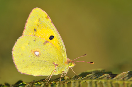 Macro seen of profile of yellow butterfly Colias on leaf of fern
