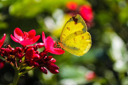 Common grass yellow butterfly on red flower