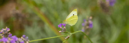 Close-up view of a lemongrass butterfly in a meadow with purple flowers