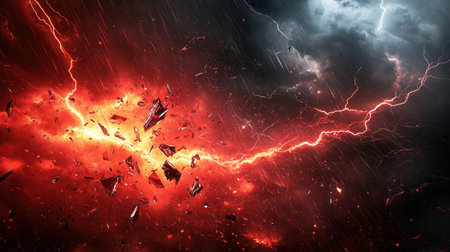Intense stormy backdrop showcases lightning flashing in a red and black sky, while fragments of glass float dramatically in mid-air.