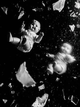 Dolls drift through a dark background surrounded by shards of glass, capturing an eerie moment that blends childhood memories with a haunting atmosphere.