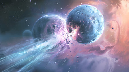 This captivating image depicts a dramatic collision between two celestial bodies resulting in a burst of pastel hued debris and energy Swirling clouds of pink and blue hues fill the frame creating a