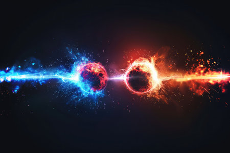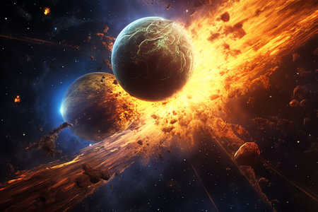 Dramatic depiction of two planets colliding, surrounded by fiery explosions and cosmic elements, symbolizing chaos and destruction.