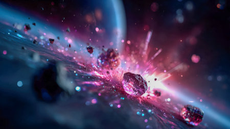 Abstract cosmic scene with glowing asteroids and colorful explosion in deep outer space.