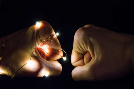 Do not leave me! Hands of a man and a woman in neon light. Art collage. Breaking up a relationship.