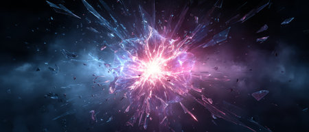 Dynamic image of shattered glass pieces surrounded by sparkling dust, creating a mesmerizing scene that captures the beauty of chaos in dramatic lighting against a dark backdrop.