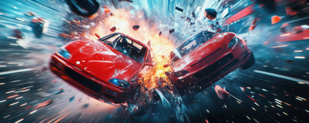 Dramatic car crash scene with two red cars colliding mid-air, surrounded by a burst of flames and debris.