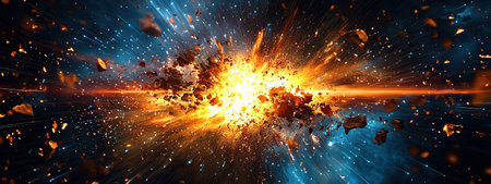 Explosive cosmic collision of asteroids in deep space with planets and glowing energy bursts.