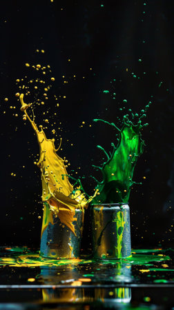 In a captivating burst of creativity, bright yellow and green paint splashes upward from two metallic cups. The vivid colors collide in mid-air against a dark backdrop, creating an artistic spectacle.