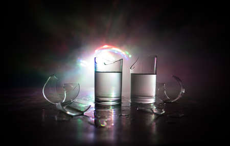 Drink, broken glass concept. Broken glasses on wooden table at dark toned background with fog. Selective focus