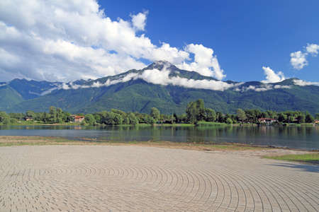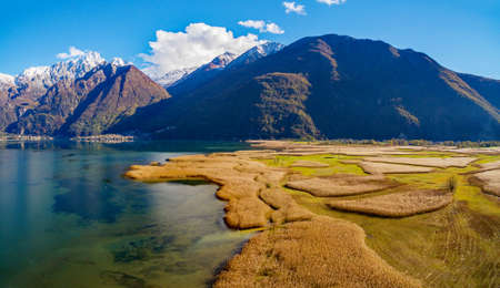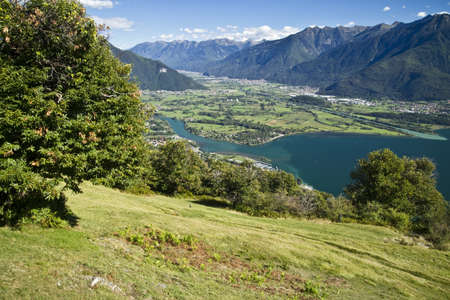 Lago di Mezzola Lake landscape. Water and mountains. Lombardy, Italy, Europe.