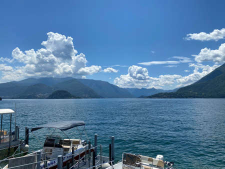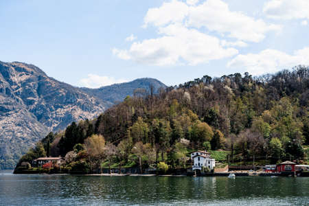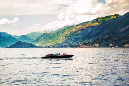 Scenic landscape of Como lake with small boat in cloudy day with green and blue water and Alps mountains in Lombardy on North of Italy. Touristic famous destination. Popular tourist attraction