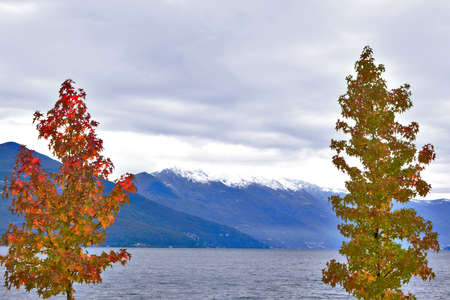 Autumn scenery of colorful trees with Alps mountains on background at Lago Maggiore, Italy