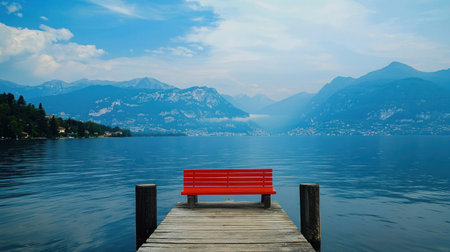 A vibrant red bench sits on a wooden pier, offering a tranquil view of a calm lake and majestic mountains under a blue sky.