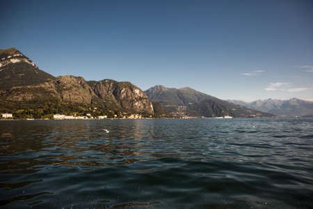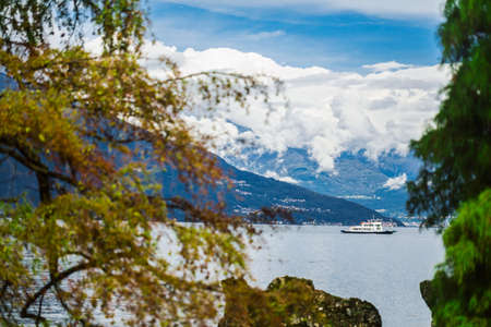 Ferry on lake Como, Northern Italy. The boat is moving on the lake against the background of the Alpine mountains. Tourist destination-Northern Italy.