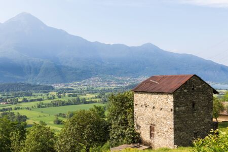 Mountain village on foggy day, italian alps, on the north of Lombardia. Village town in Europe. Beautiful rural landscape. Autumn rain and fog on the mountain hills. Discover concept
