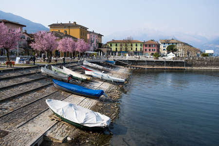 COLICO, ITALY - MARCH 20, 2022: First day of Spring in Colico (Italy). The slipway, cherry blossoms and typical old houses in the historic touristic village on Lake Lario, shot in spring light on Mar