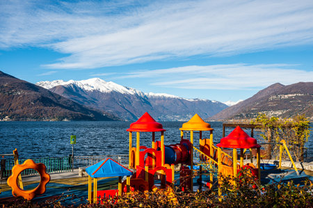 The colorful playground in Luino with the lake and snow-capped mountains in the background