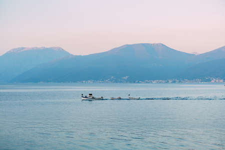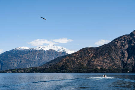 Lake Como (Italy) summer evening view with boat on water and Alps mountain behind.