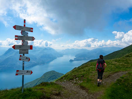 Trekking scene on Lake Como alps (the arrows indicates the names of the locations reached by the trails)