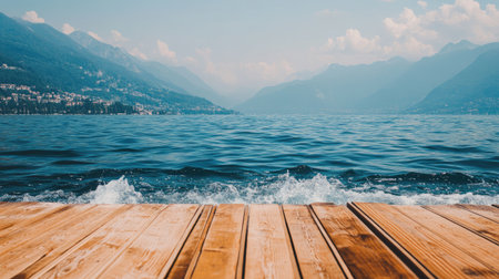 A captivating view of a calm lake framed by majestic mountains under a clear blue sky. The image features a wooden deck in the foreground, creating a serene atmosphere perfect for relaxation and enjoyment of nature's beauty.