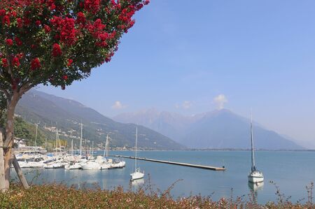 small yacht harbor at Lake Como, Italy, on a sunny september morning, with mountains in the background, red blooming tree in the foreground