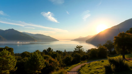 A beautiful mountain range with a lake in the foreground. The lake is calm and the mountains are covered in trees. The sky is clear and the sun is shining brightly. The scene is peaceful and serene. Como Lake, Italy