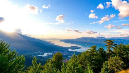 the serene cityscape presents a tranquil mediterranean lake scene, where a lone boat glides across calm waters, surrounded by majestic mountainous vistas, evoking a sense of introspective calmness, with a palette of soothing dark green, aquamarine, dark turquoise, and light brown hues, reminiscent of a swiss-inspired lake wallpaper, captured in a unique webcam photography style. ai generated