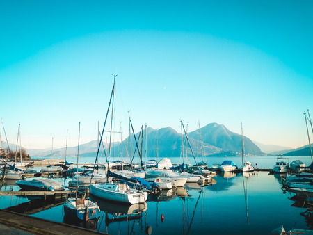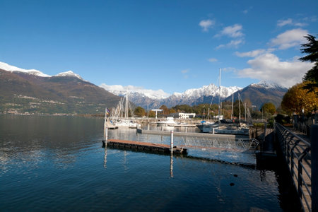 COLICO, ITALY, November 09, 2019 Colico embankment panoramic view with ships and mountains on back , Lake Como, Northern Italy, Europe