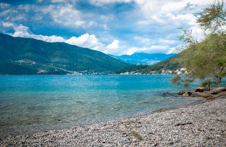 Autumn beach. Beautiful sunny Mediterranean landscape. Montenegro, Adriatic Sea, Kotor Bay. Bijela town ( Herceg Novi )