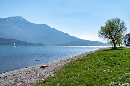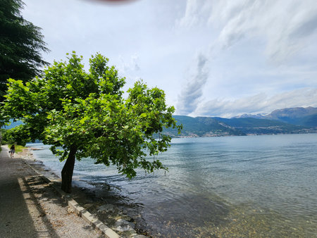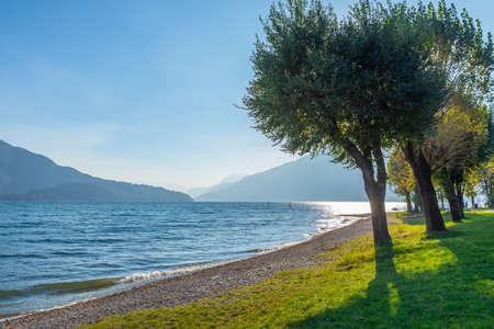 Trees on the shores of Lake Como. Landscape, nature in Domaso. Lake and sports on a sunny day. Freedom.