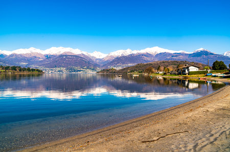 The Como Lake at the town of Fumiarga near Colico with the Valtellina in the background, Italy